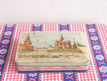 ロシア モスクワの赤の広場にあるロシア正教会の大聖堂が描かれた缶です。