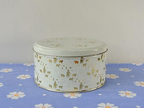 白地に金色の羊飼い柄のプリントされた缶です。