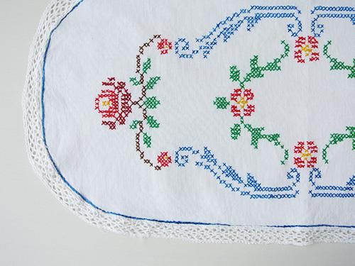 レトロなお花柄がクロスステッチされたテーブルセンターです。
