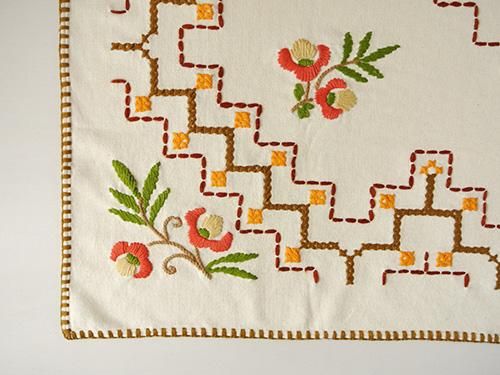 幾何学模様とお花が刺繍されたテーブルクロスです。