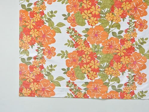 暖色系のレトロなお花柄がプリントされた大きなカーテンです。